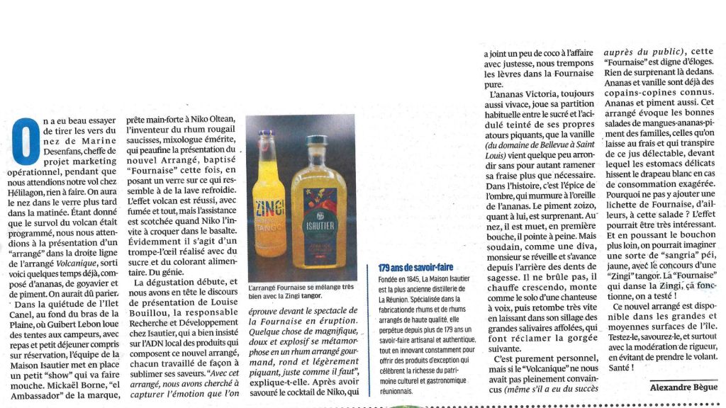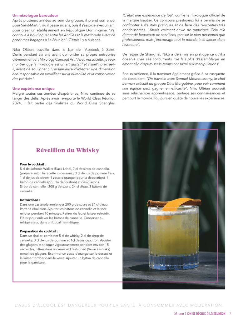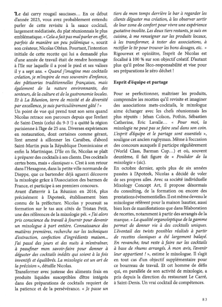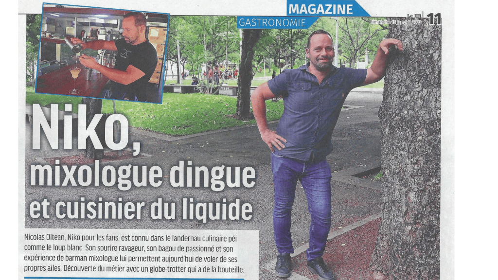 Niko fait l’objet d’un portrait dans le Journal de l’Île de La Réunion (JIR). C’est à l’occasion du lancement de son cocktail innovant, le « Daïcary Rougail Saucisses ». Ce cocktail unique s’inspire des saveurs emblématiques du plat traditionnel réunionnais. Il allie créativité et tradition pour offrir une expérience gustative inédite. Niko, mixologue renommé, continue de surprendre avec des créations originales qui célèbrent la culture culinaire de La Réunion.