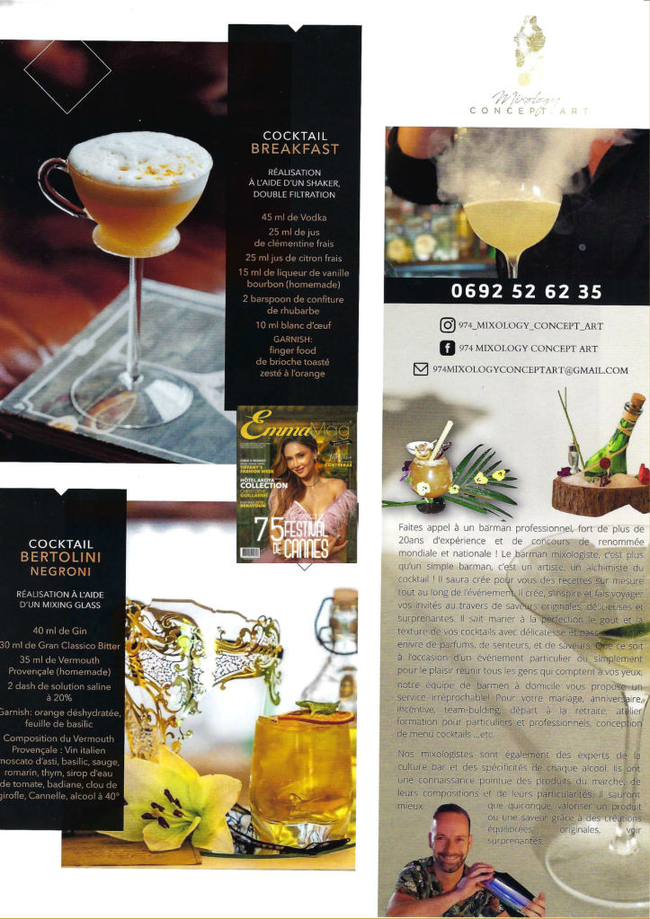 10 janv. 2023- Niko est reconnu pour son expertise en mixologie. Il est régulièrement invité à participer à des émissions culinaires locales à La Réunion. À ces occasions, il met en avant ses créations de cocktails uniques. Ces apparitions lui permettent de partager sa passion pour l’art du cocktail avec un large public. Il valorise les produits locaux et fait découvrir de nouvelles techniques de mixologie. À travers ces émissions, Niko présente des cocktails innovants. Ils sont souvent inspirés de la culture créole. Cela renforce son image de mixologue de renom sur la scène locale et internationale.
